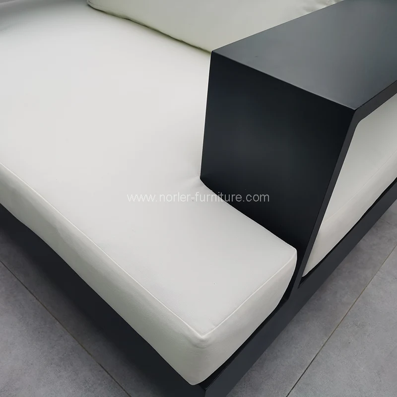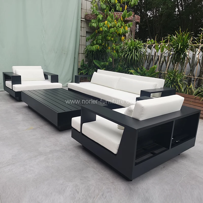 Norler China Fashion Modern minimalistisk svart aluminiumsramme Utendørs sofa kombinerer moderne minimalistisk design med high-end værbestandige materialer, og gir den ultimate komforten og mote for uterom. Vi har et moderne produksjonsanlegg, og tar i bruk standardiserte produksjonsprosesser fra råstoffinnkjøp til ferdig produktemballasje for å sikre rask levering og støtte bestillingsproduksjon. Våre utendørs sofaer legemliggjør ikke bare utmerket håndverk og kvalitet, men er også avhengige av selskapets sterke produksjonsstyrke- og servicefunksjoner for å hjelpe kundene med å forbedre markedet for markedet og skape et ideelt valg for avanserte uterom!