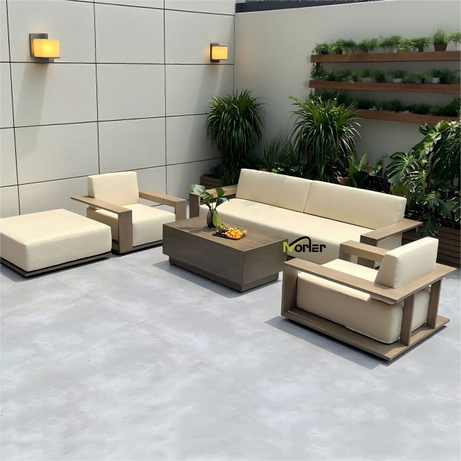5. Utendørssofa i teak: Laget av svært værbestandig naturlig teak, har denne sofaen et fint korn, høy stabilitet, og utvikler en mer luksuriøs følelse ved bruk, noe som gjør den til et klassisk valg for å lage en balkong i luksuriøs feriestil.