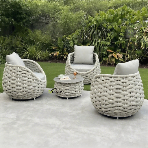 1. Rottingsofa: Laget med PE-rotting med høy tetthet, den er sol- og regnbestandig, og skaper en naturlig og varm utendørsatmosfære.
