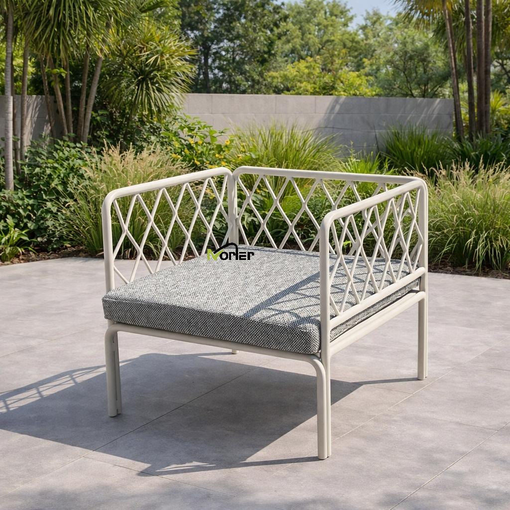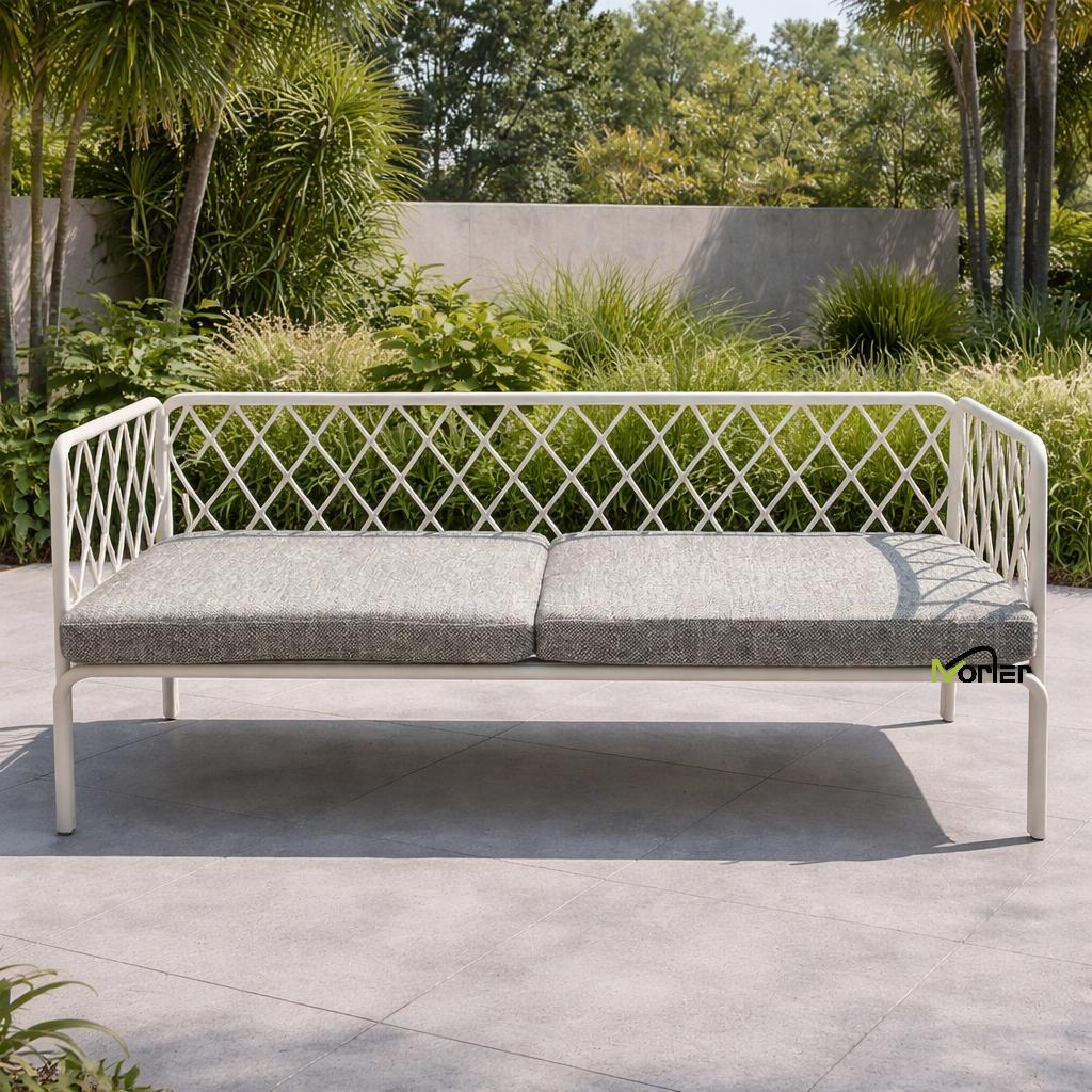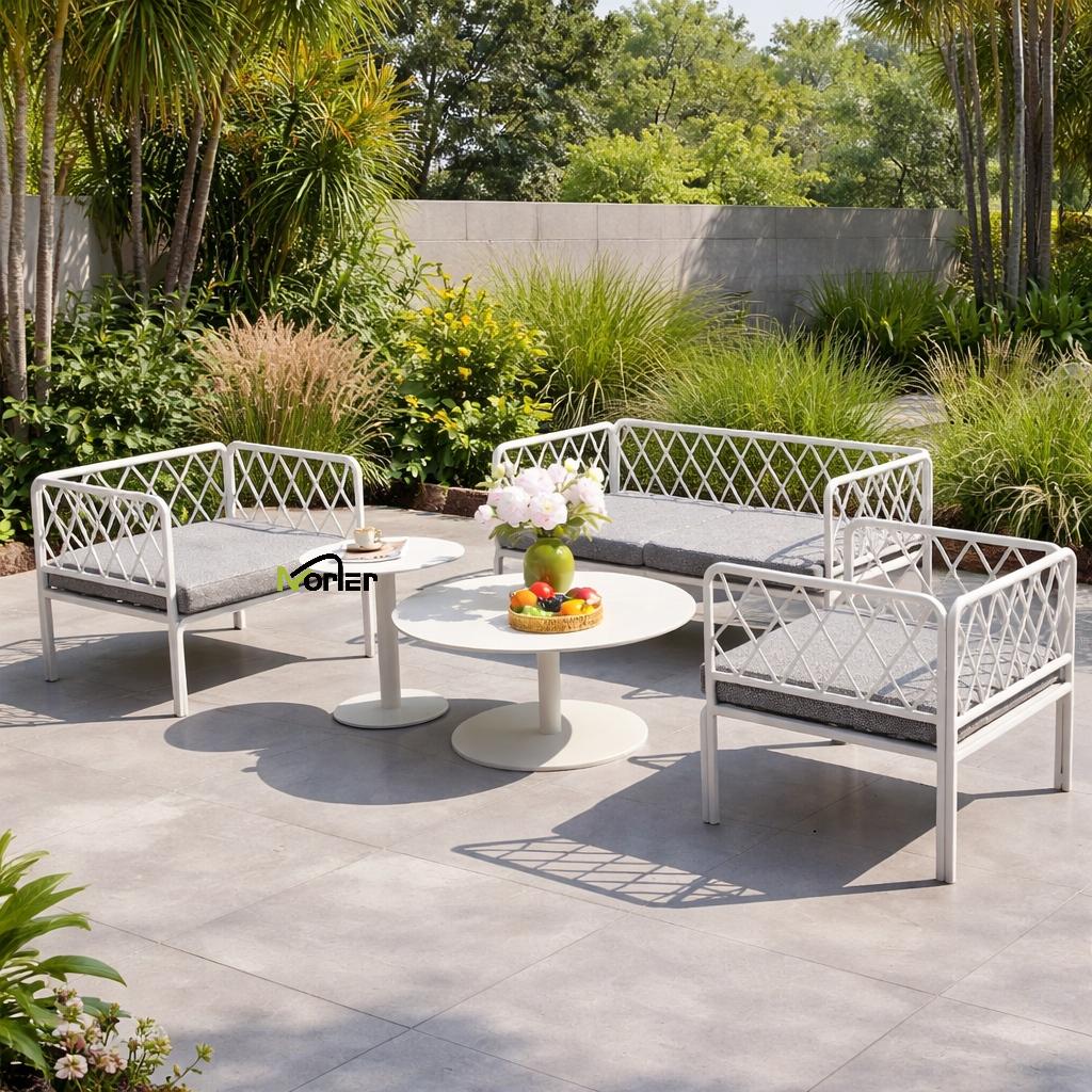 Dette moderne utendørs sofasettet har et rent og minimalistisk design med en vakkert utformet geometrisk metallramme. Den åpne gitterstrukturen skaper et lett og elegant utseende samtidig som den opprettholder sterk strukturell støtte.